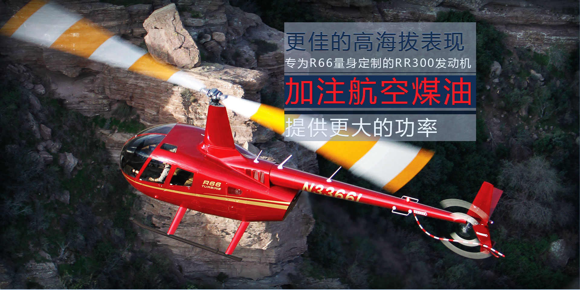 專門為R66設(shè)計(jì)的RR300發(fā)動(dòng)機(jī)使用航空煤油,大大提升了剩余功率,高海拔作業(yè)能力和更大的載荷能力。