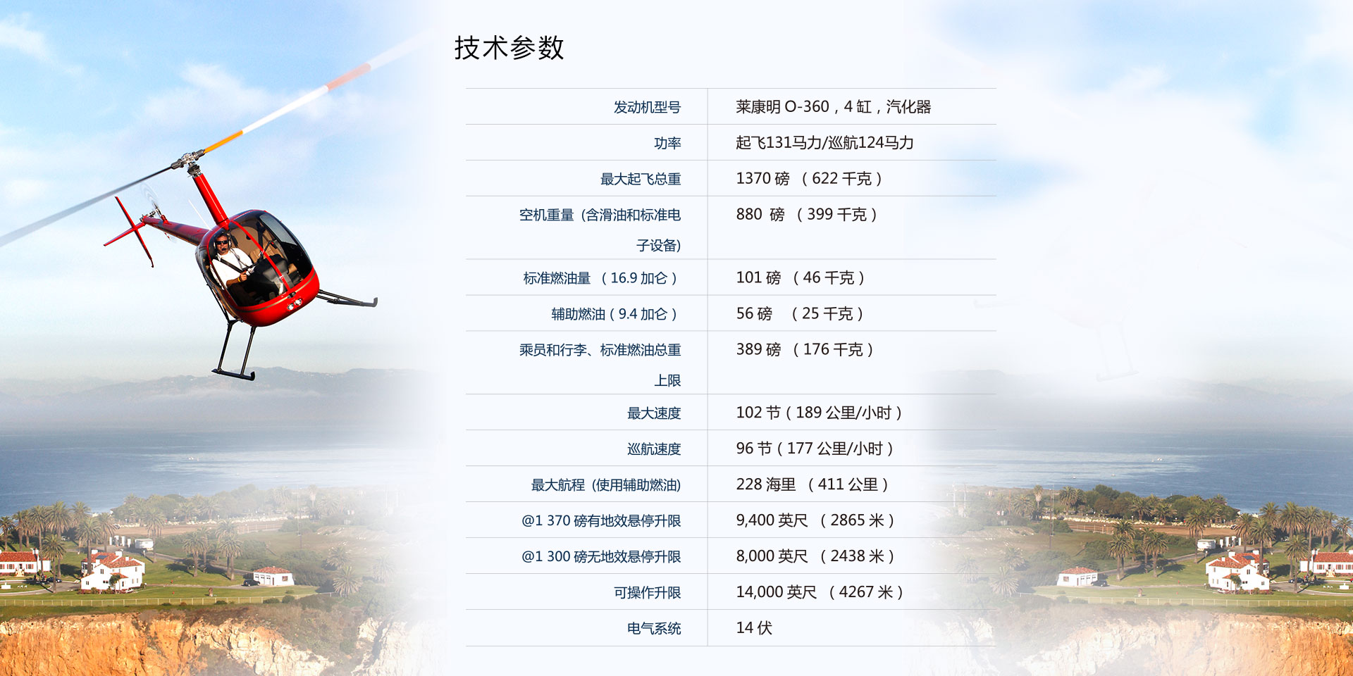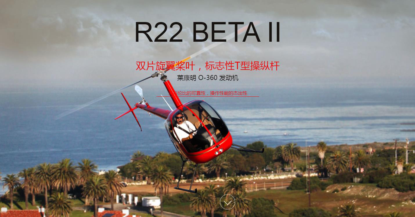 美國羅賓遜直升機公司所研制的R22保持了在相同重量等級內的包括速度、高度和距離的每一項性能記錄。并且最新型的R22貝塔仍然擁有在飛機行業(yè)內最實惠的價格和最低的操作成本。