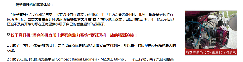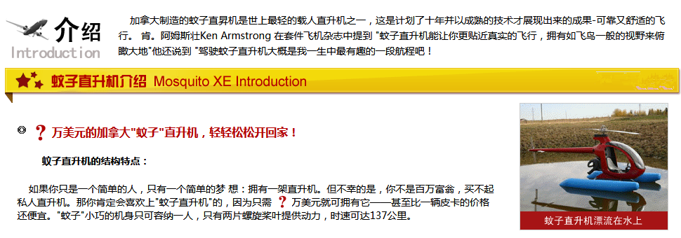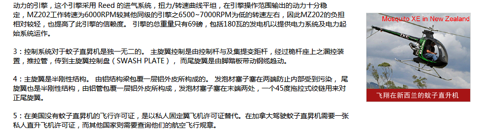 蚊子直升機是世界上價格最便宜的直升機,符合美國FAA標(biāo)準(zhǔn)。蚊子直升飛機的前身制造曾以美國軍用武裝偵察直升機為基礎(chǔ),其性能卓越,適合多種地型和氣象下的作業(yè)。