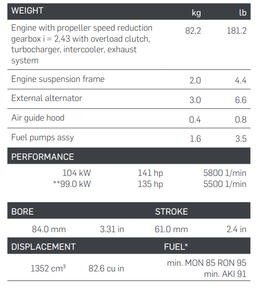 基于Rotax 912/914系列發(fā)動機(jī)的成熟概念,Rotax 915 iS發(fā)動機(jī)提供了更大的功率,在150kW以下同類發(fā)動機(jī)中具有最佳的功重比,最大起飛功率高達(dá)15000英尺(4570米),使用升限為23000英尺(7010米)。