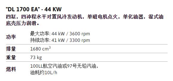 LimbachL1700 EA航空發(fā)動機(jī)"DL 1700 EA" - 44 KW,四缸,四沖程水平對置風(fēng)冷發(fā)動機(jī),單磁電機(jī)點(diǎn)火,單化油器,濕式油底殼壓力潤滑。