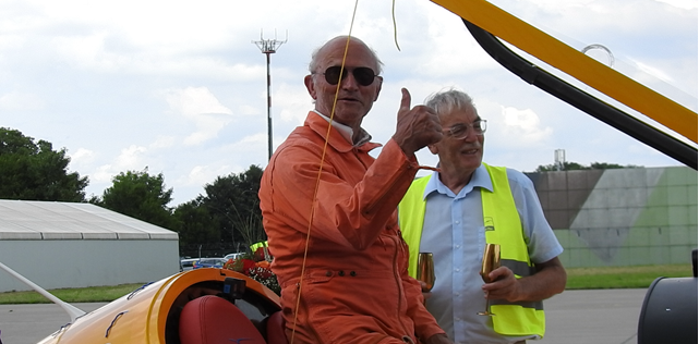 該機(jī)主設(shè)計(jì)師、Elektra Solar公司創(chuàng)始人兼首席執(zhí)行官 Calin Cologan(右)與試飛員 Uwe Northmann(左)慶祝首飛成功