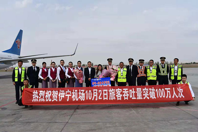 2018年10月2日13:50隨著南航CZ6823烏魯木齊-伊寧航班降落伊寧機場,旅客吞吐量提前突破100萬人次。伊寧機場在機坪舉行了簡單的慶?;顒樱ぷ魅藛T為第100萬位幸運旅客和機組送上鮮花,并贈與幸運旅客一張伊寧-烏魯木齊的免費往返機票。